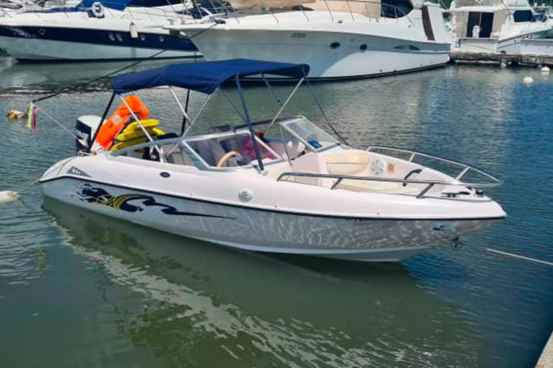 RADIO, SALVAVIDAS, GPS, PROFUNDIMETRO FISHFINDER, ANCLA, CABO, LUCES, DOBLE BATERIA, MASTER SWICTH, CORNETAS, SIRENA, BOMBA Y DUCHA DE AGUA DULCE, PUESTO VERTICAL EN CLUB BAHIA DE LOS PIRATAS.
