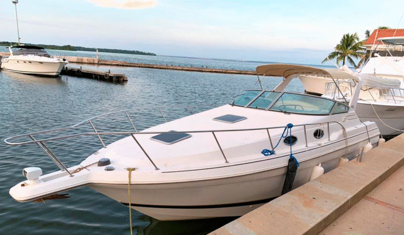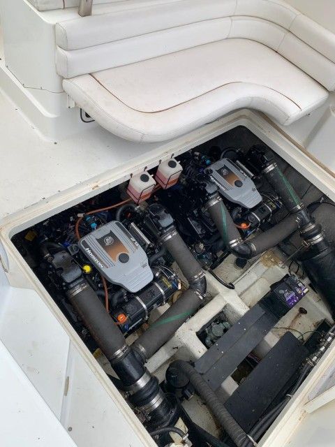 TAPICERÍA TIPO FIBRA DE CARBONO, TECHO EXTENDIDO HACIA PROA Y POPA Y FORRO TOTALMENTE NUEVOS NOVIEMBRE 2021, MANTENIMIENTO DE MOTORES RECIEN, MOTORES CAJAS NUEVAS CON FACTURA AÑO 2015 VESSELVIEW 7 TOUCH SCREEN, MANDOS ELECTRÓNICOS, WINCHE DE PROA ELÉCTRICO LUCES UNDERWATER DE COLORES LUCES LED DE POPA, EMBARCACIÓN DE EJES (PATA DE GALLINA) PUEDE TENERLA EN AGUA COMO YATE O EN COLMENA EN TIERRA, PLANTA ELÉCTRICA AIRE ACONDICIONADO ORIGINAL BOMBAS DE AGUA Y BATERÍAS NUEVAS (3), VELOCIDAD CRUCERO 35-38 MILLAS, DUERMEN 4 PERSONAS COMODAMENTE, BAÑO COMPLETO, NEVERA, MICROONDAS, DOS HORNILLAS ELÉCTRICAS.